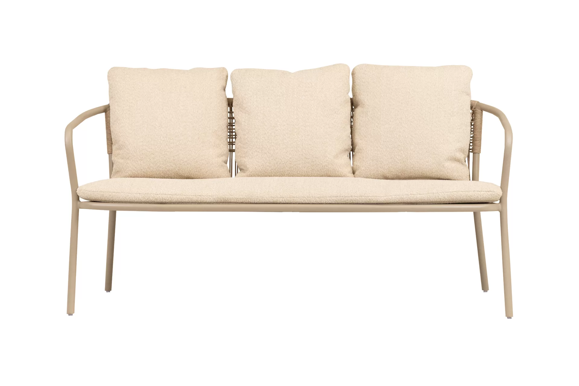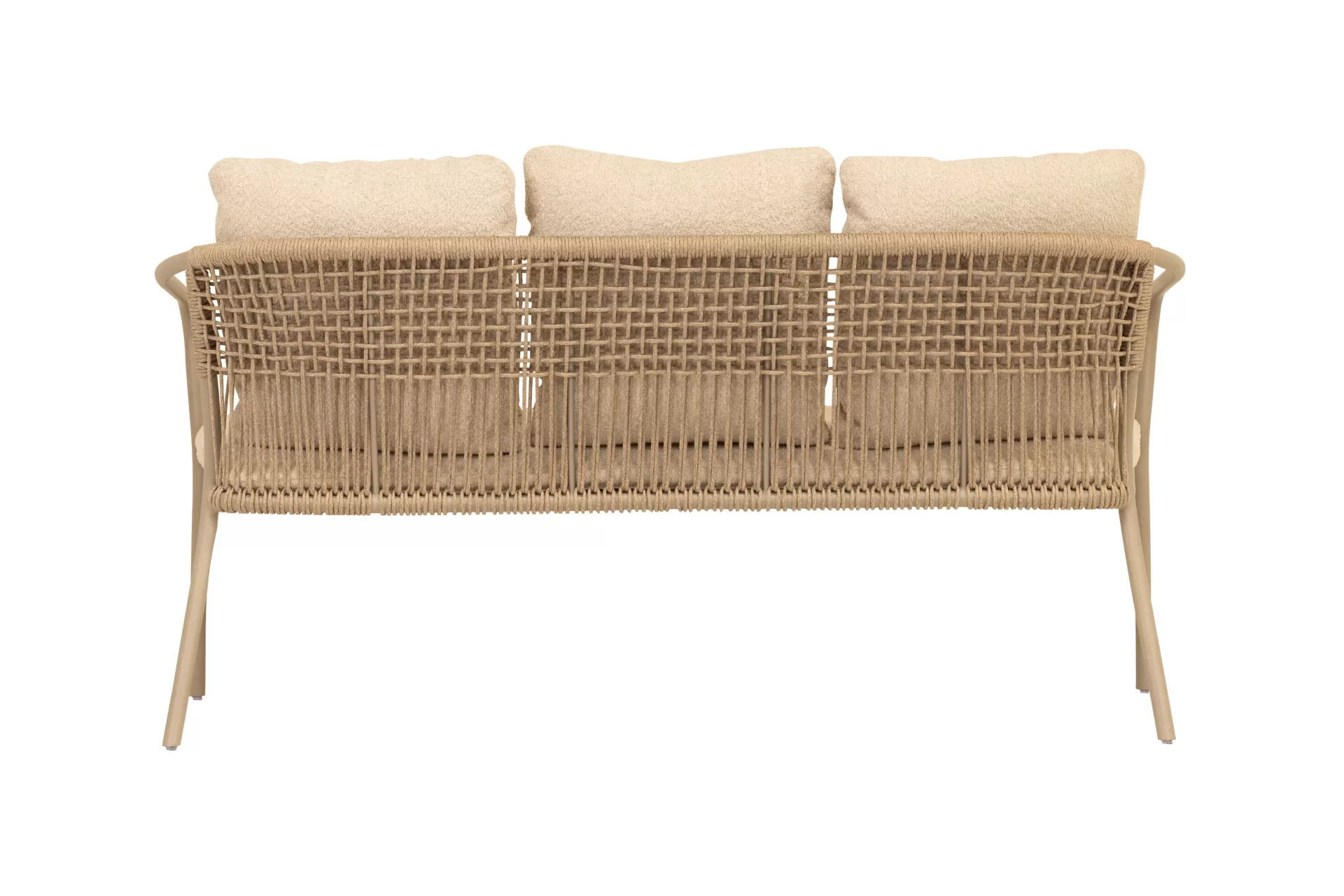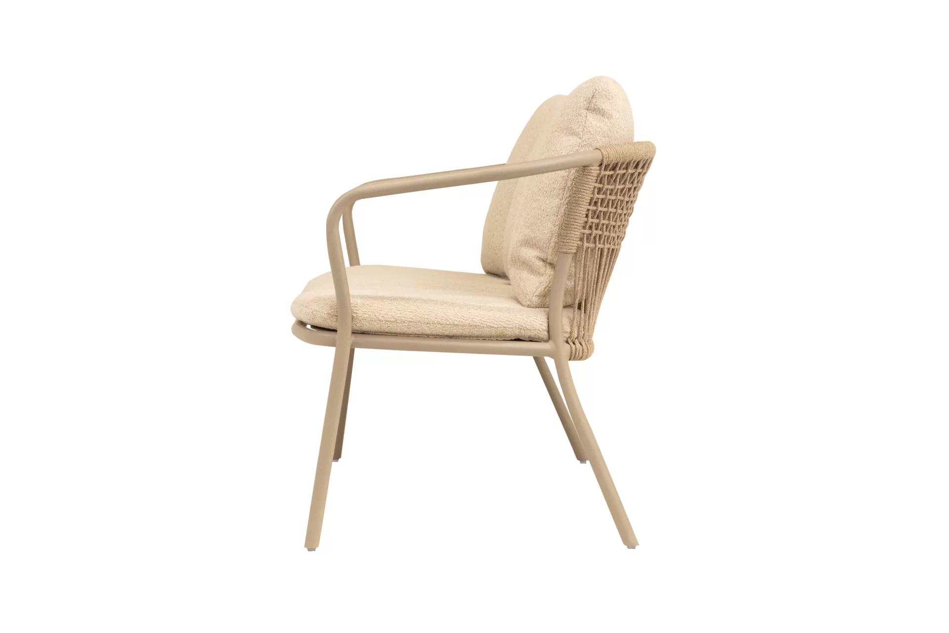 Estrutura em alumínio, com encosto tramado em corda náutica e almofada de assento solta