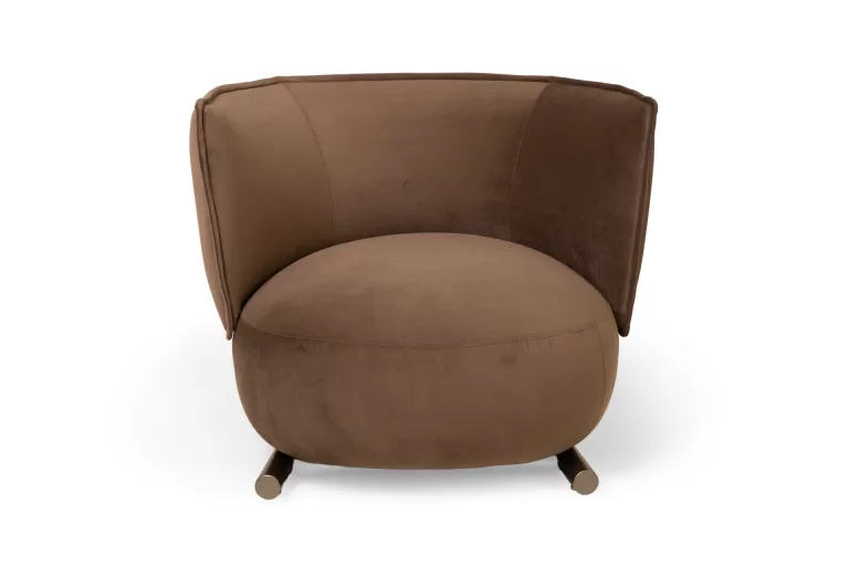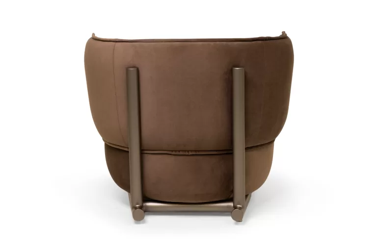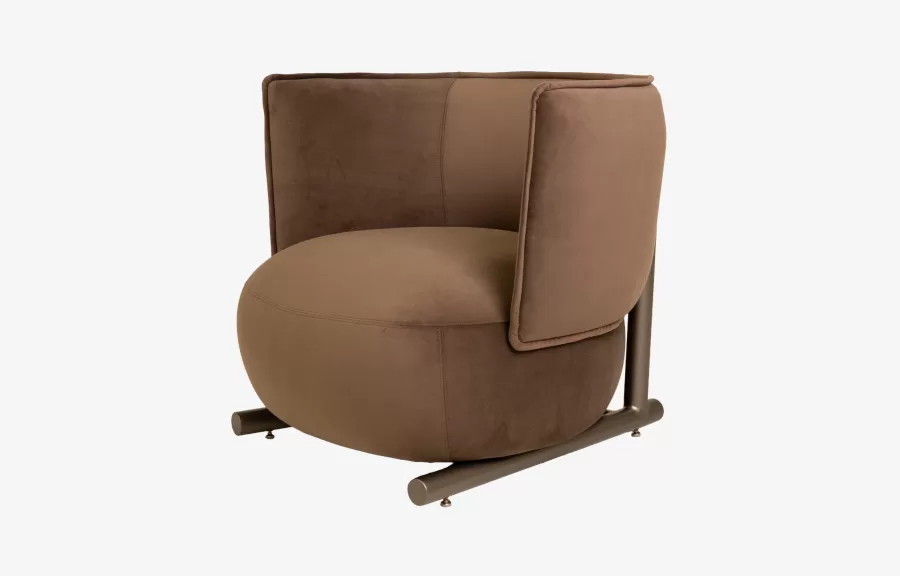 Na Poltrona Bou, o traço estrutural encontra o volume orgânico. A base metálica sustenta com leveza um assento generoso e um encosto envolvente, criando um contraste elegante entre forma fluida e rigor construtivo.