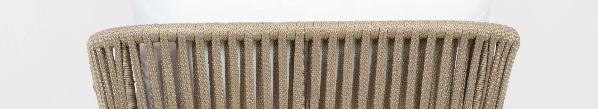 Concha em alumínio recoberta por pintura eletrostática e tramada artesanalmente em corda de polipropileno UV. Almofada de assento confeccionada em espuma CF6 (D26 Soft) flexível de poliuretano poliéster de alto desempenho, envolta em manta de poliéster siliconada. Almofadas de encosto em superpluma. A almofada decorativa é vendida separadamente.
