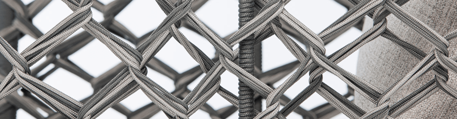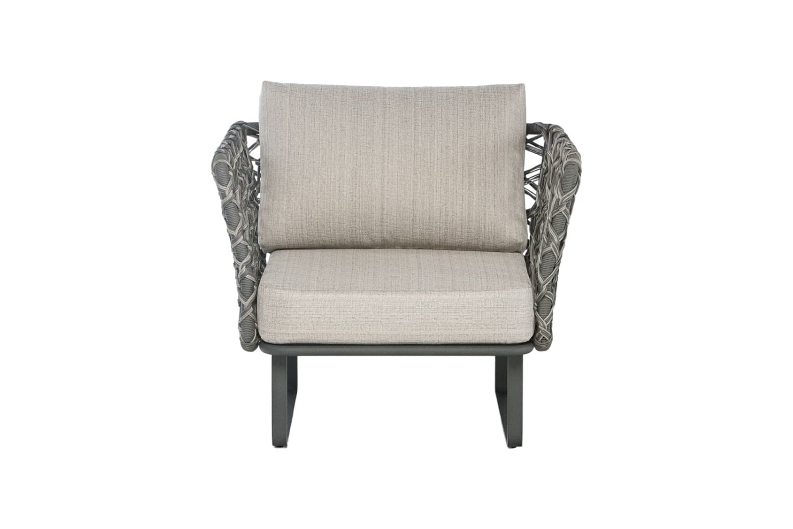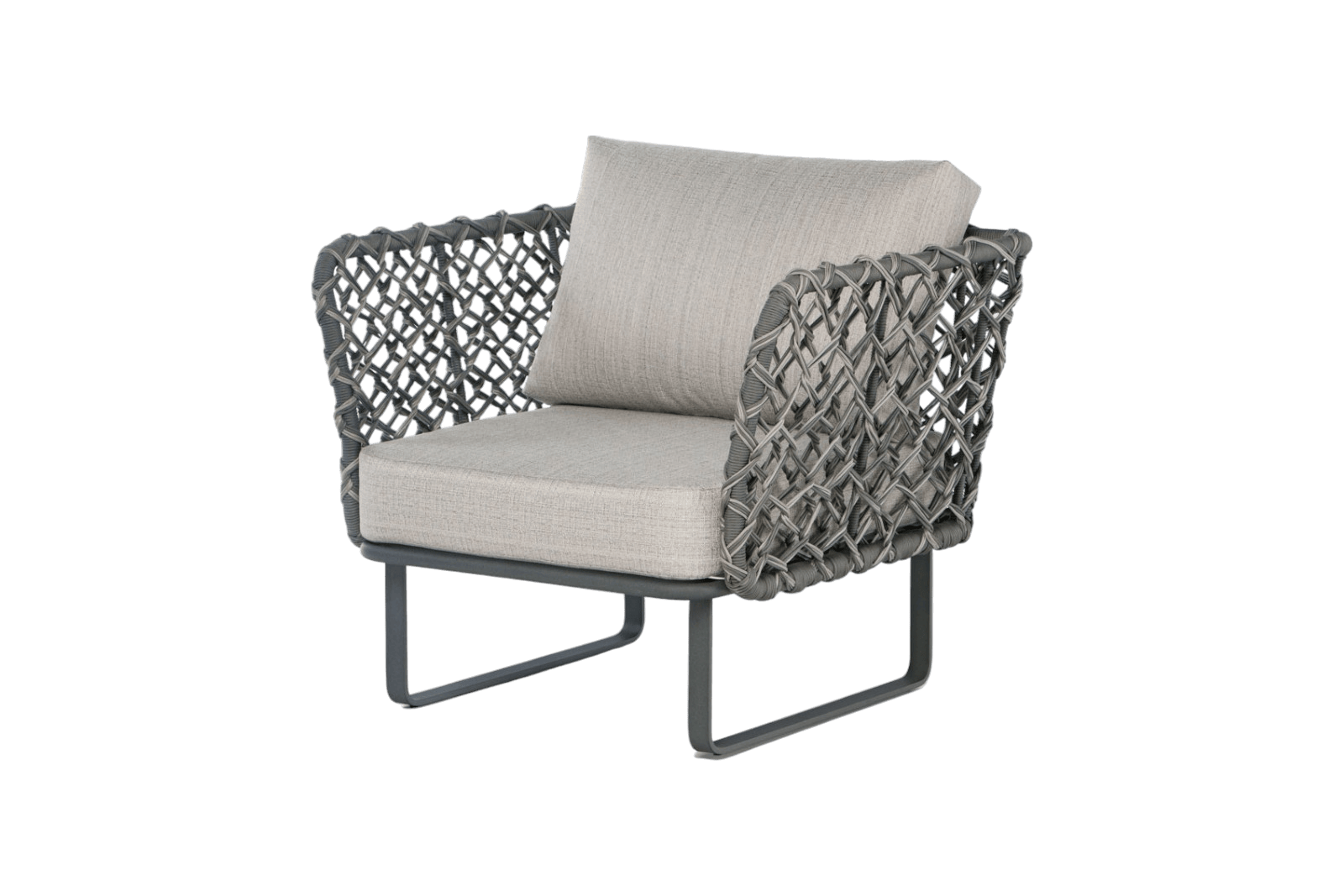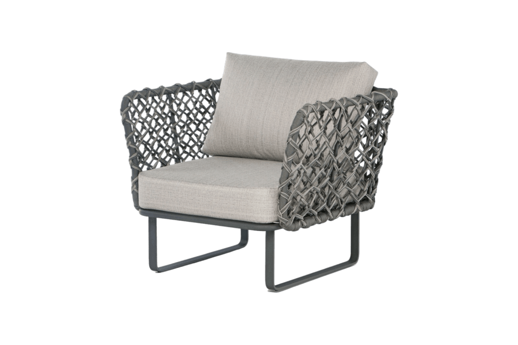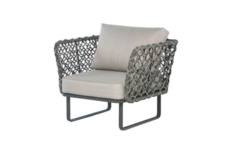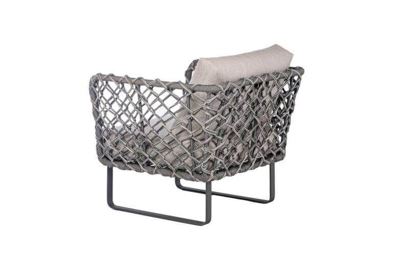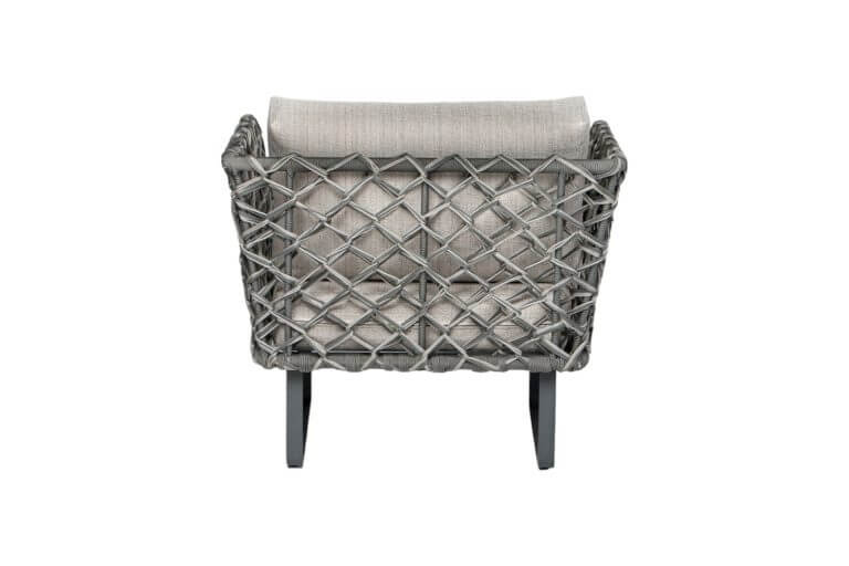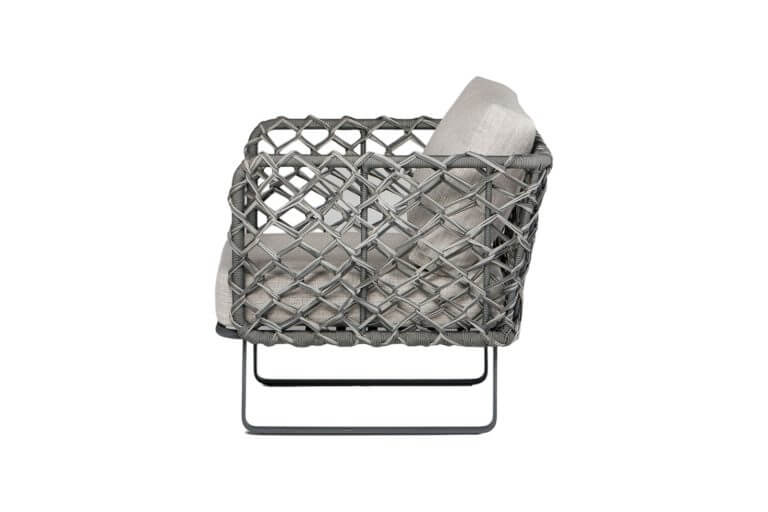 A estrutura da poltrona é feita em alumínio, conferindo resistência e durabilidade à peça. Além disso, a trama de corda no encosto e braços da poltrona dão um toque especial e diferenciado ao design.