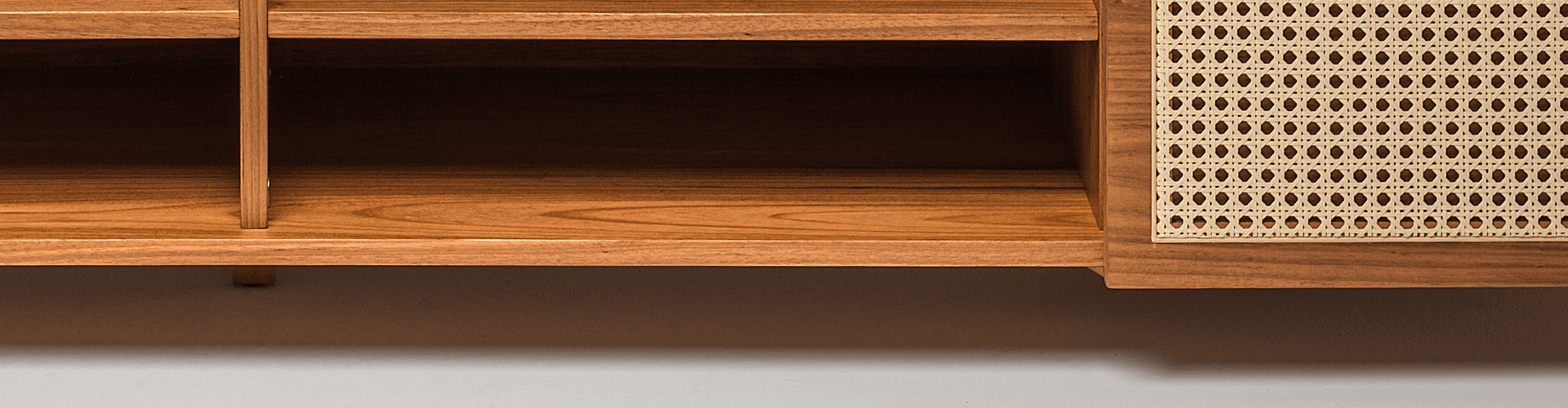 Ele apresenta duas portas de correr que oferecem acesso conveniente ao espaço interno, permitindo que você guarde seus pertences de forma organizada e discreta. O diferencial deste rack é a aplicação de tela sextavada em Fibra Natural de Algodão, que reveste as portas e laterais, adicionando um toque de sofisticação e textura ao design.